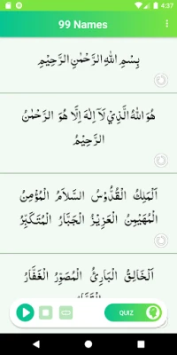 Descubre "99 Names of Allah: Memorize 99 names of Allah & Quiz", una aplicación para explorar y memorizar los 99 nombres de Alá, conocidos como Asma Al-Husna. Aprende los nombres más hermosos de Dios y pon a prueba tu conocimiento con su función de cuestionario. Ideal para el estudio espiritual.