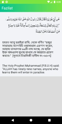 Para facilitar este profundo viaje espiritual, hemos desarrollado una herramienta dedicada a guiarle en el aprendizaje y la memorización de estos 99 Nombres sagrados. Con una interfaz intuitiva y un diseño pensado en el usuario, esta aplicación le permite leer cada uno de los nombres en árabe, presentados con una fuente clara y atractiva que realza su belleza. Además, profundice en la 'fazilat' o los beneficios y virtudes de cada nombre, con explicaciones detalladas disponibles tanto en inglés como en bengalí, enriqueciendo su comprensión y conexión espiritual.
