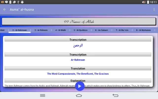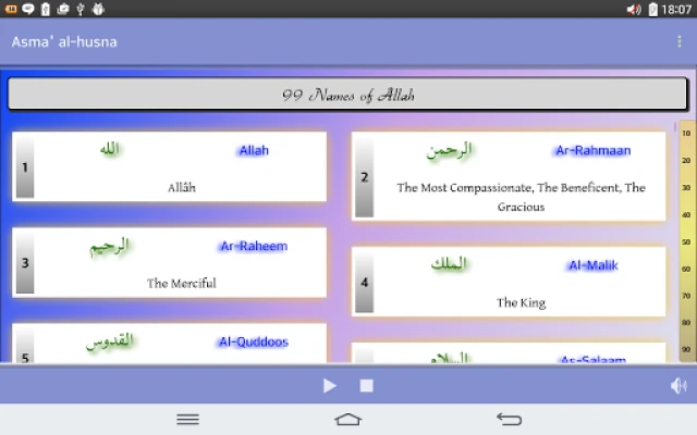 Explora los 99 nombres de Alá en el Islam con esta aplicación educativa. Cada nombre se presenta en árabe, con su transcripción y traducción detallada. Aprende fácilmente con la función de audio integrada, que te permite escuchar cada nombre para una pronunciación correcta y una comprensión profunda.